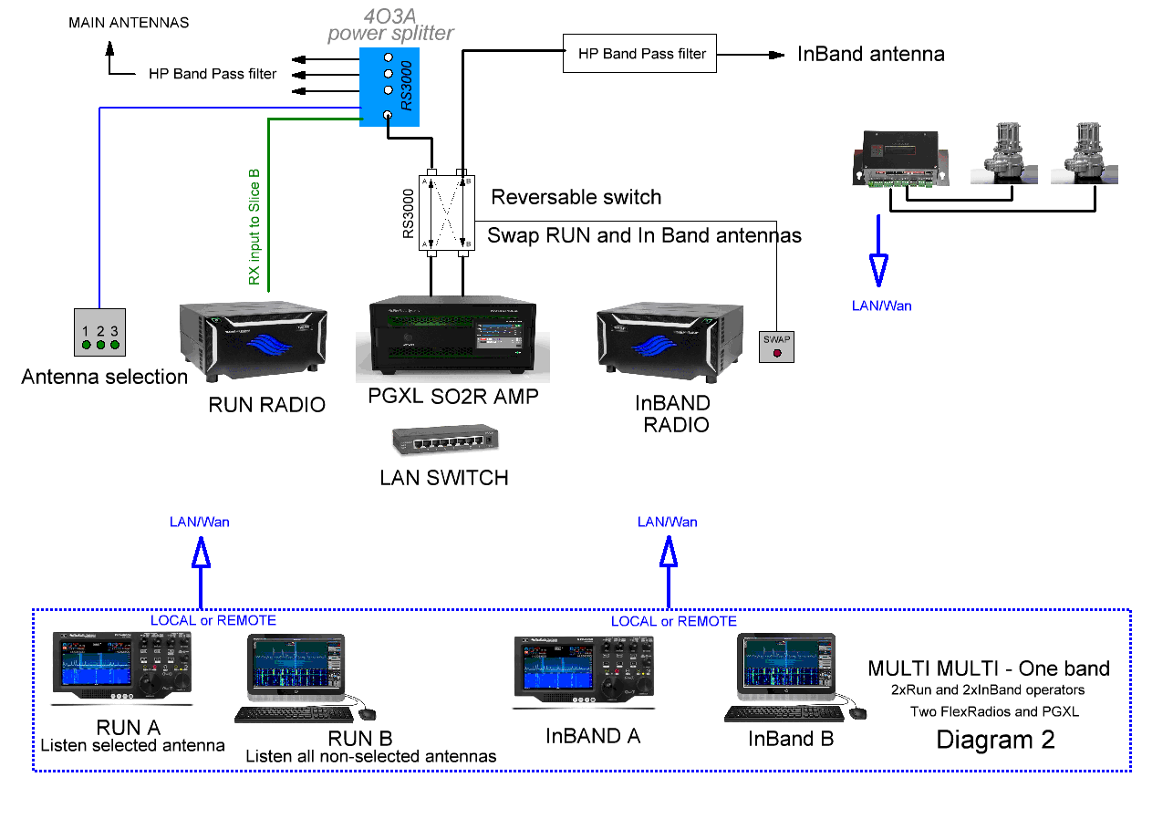 For serious M2 setup In Band stations are mandatory. This setup is a SO2R or M2 configuration with one In band radio on each RUN band.