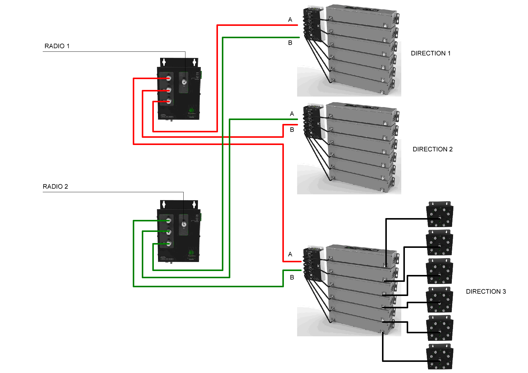 38. Six radios and 14 antennas with power splitting in 3 directions